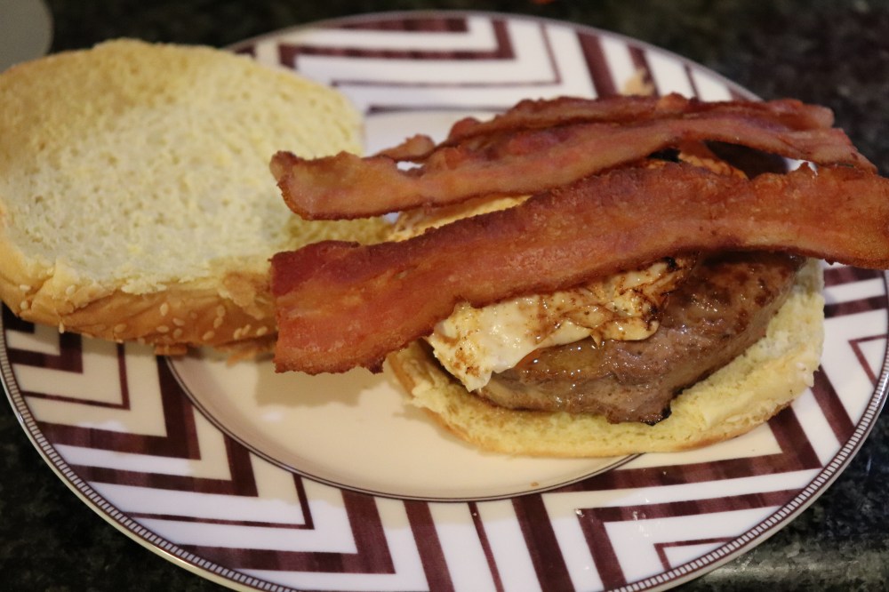 Assemble the burger with the patty at the bottom, an egg and then topped with bacon. Serve with any other burger toppings.