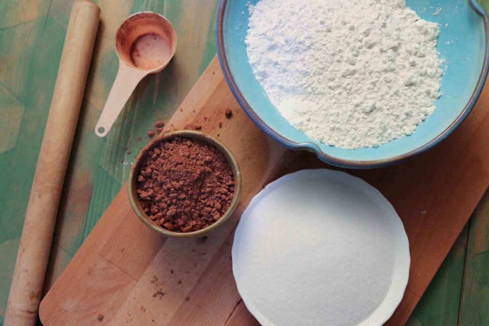Start by preheating the oven to 350 degrees F. Measure out 2 cups flour, 3/4 cup cocoa and 2 cups sugar.