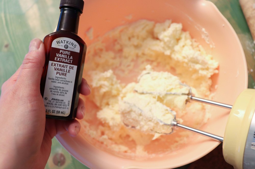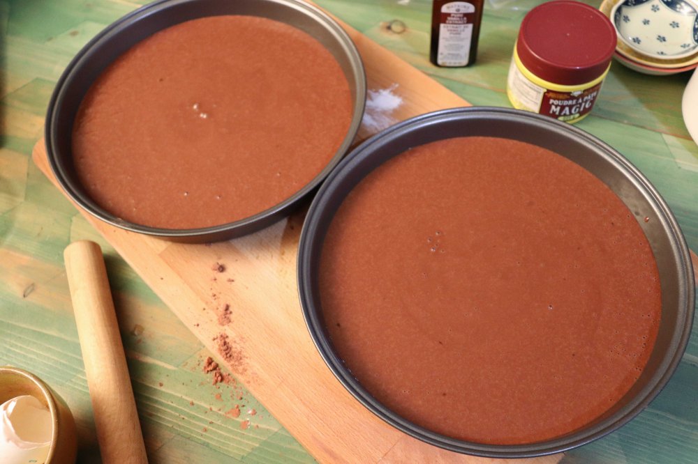 In two 9 inch pans, line the bottoms with parchment paper. Fill both pans evenly with the batter. Place in a pre-heated oven and bake for 30-35 minutes or until a toothpick comes out clean.
