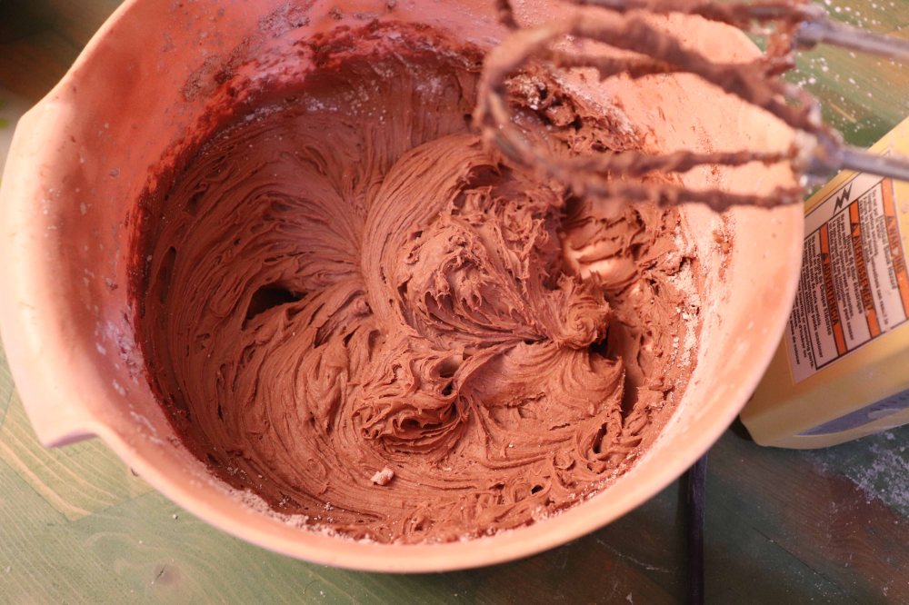 Since I love cream cheese frosting, I decided to make that instead of the buttercream. Start with 8 oz cream cheese. Place it in a bowl and beat until smooth. Add 1/2 cup softened butter and mix until blended. In a separate bowl, shift the 3 cups icing sugar and 1/2 cup cocoa. Add the salt, vanilla and icing sugar mixture slowly into the cream cheese.