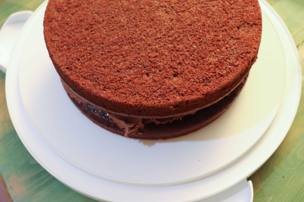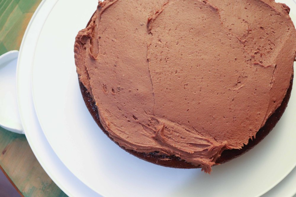 Place the second cake layer on the first but make sure you do it upside down. This make the top look smooth. You can also cut the tops of the cake off if its too round.