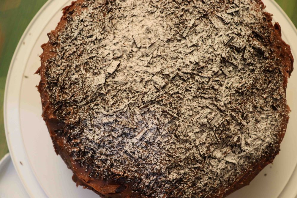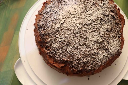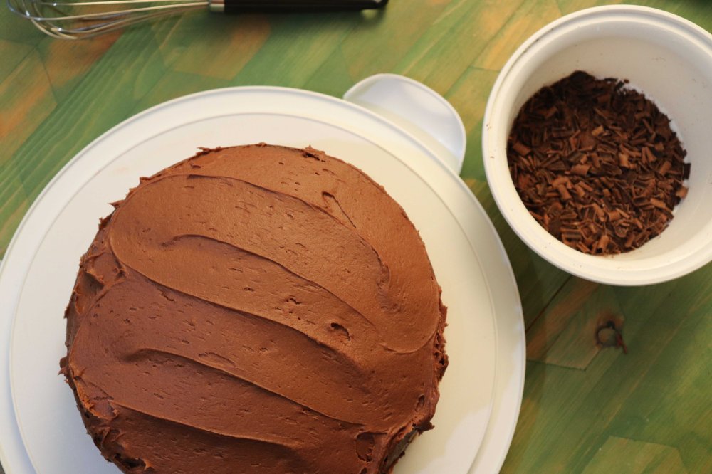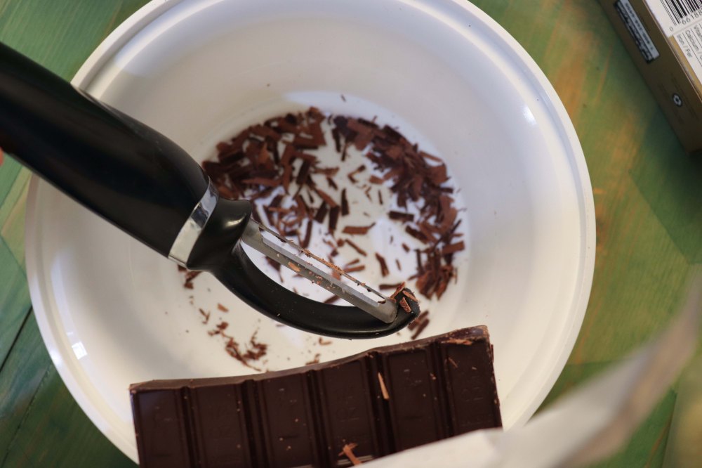 To add something more to the cake, make some chocolate shavings. Take a chunk of dark chocolate and using a vegetable peeler, carefully make shavings.