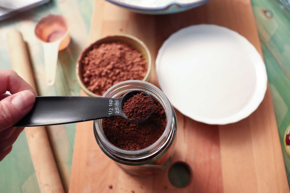 Measure out 2 teaspoons baking powder, 1 1/2 teaspoon baking soda, 1 teaspoon salt and 1 teaspoon of espresso powder. Don’t omit the espresso!! It helps give the cake a rich chocolate taste. I also used instant decaf espresso powder instead of the regular stuff because I knew some kids would end up eating the cake.