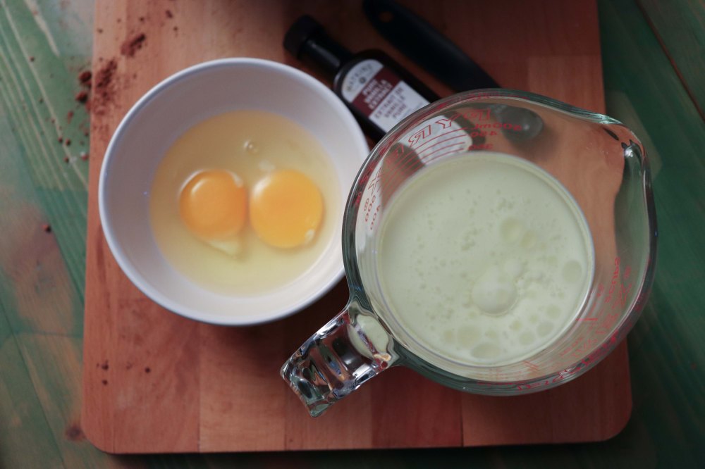 Set aside the dry ingredients. For the wet ingredients, you will need 2 eggs at room temperature, 1 cup buttermilk, 1/2 cup canola oil, 2 teaspoons vanilla extract and 1 cup boiling water.
