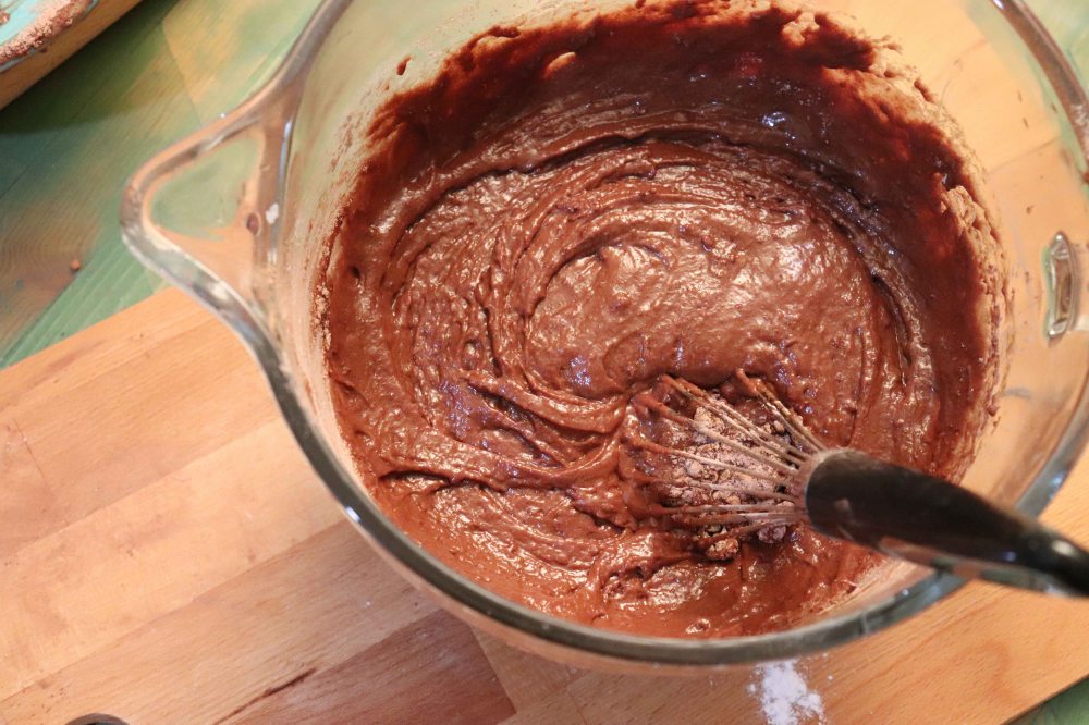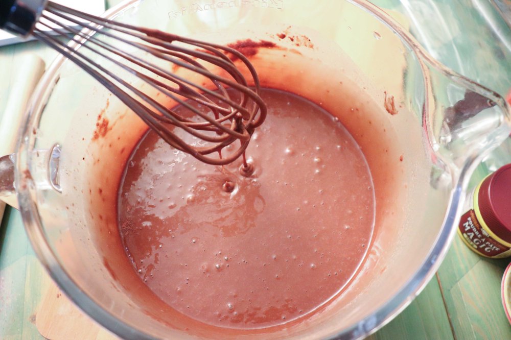 Slowly add the boiling water and stir until everything is well combined. The batter will look really runny but that is ok!