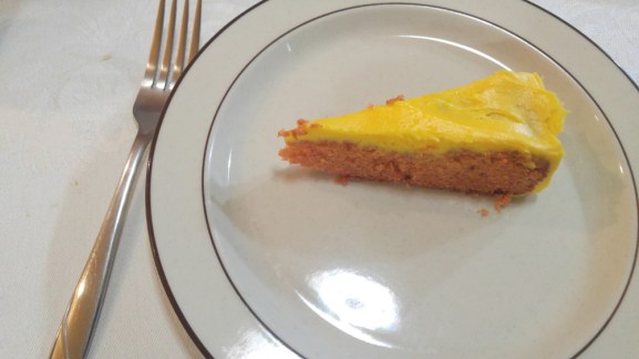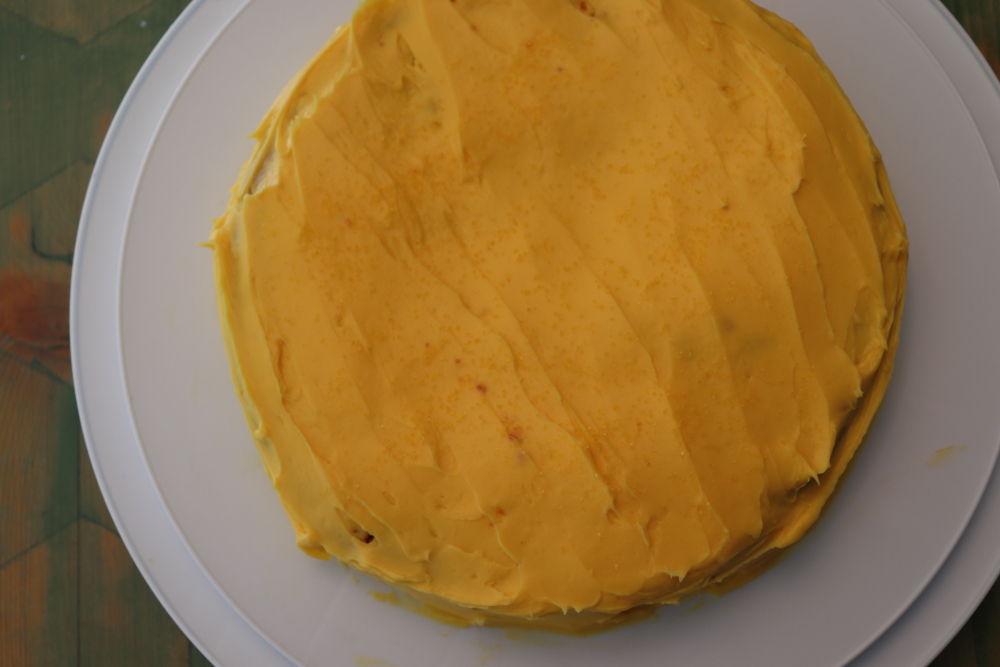 Carefully ice the cake with your (mustard) icing. For a bit of extra glam, I sprinkled some yellow sugar sprinkles. The served the cake to my family during Chinese New Years. I didn’t tell them what flavour it was at first and they assumed it was mango because of the icing. They couldn’t guess the flavour when they ate it and liked the taste. It reminded me of a light spice cake and was slightly salty. Overall it was not a terrible cake and I would make it again. Try it for yourself and see if you like it.