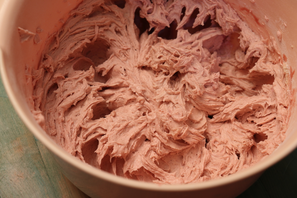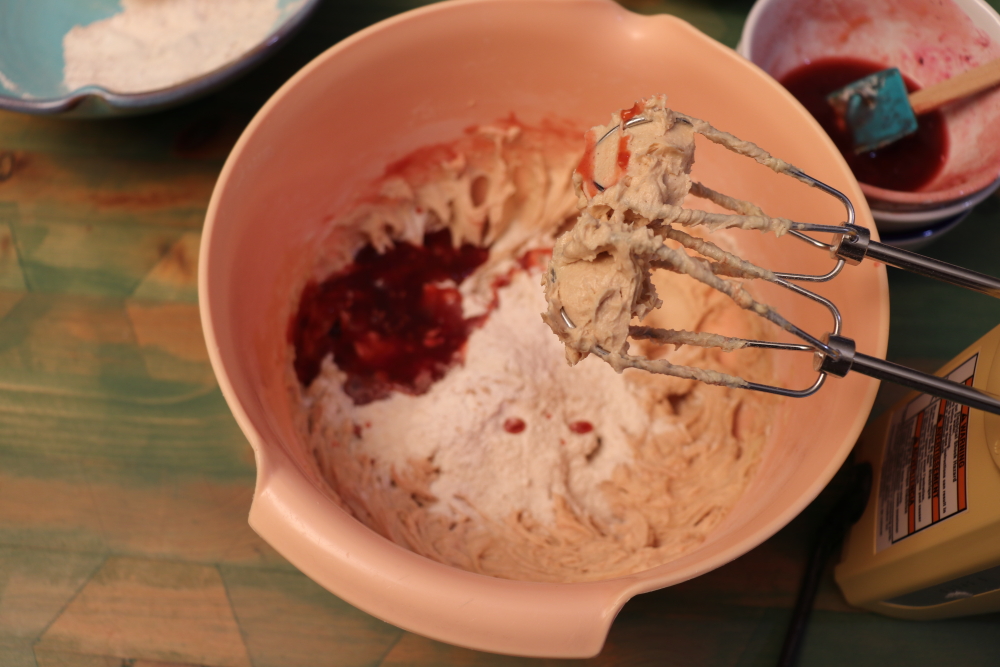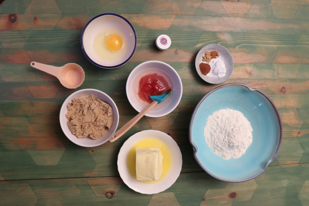 In a separate bowl, mix together 2 cups of flour, 2 tsp baking powder, 1 1/2 tsp cinnamon, 1/2 tsp nutmeg, 1/2 tsp ground ginger and 1 tsp baking soda. In another small bowl, mix together 1/2 cup ketchup and 1/2 water. I added the 2 tbsp red food colouring too (in actuality it was burgundy gel since I ran out of red food colour). Mix the dough by alternating a portion of the flour mixture and ketchup mixture until they are both completely mixed in.