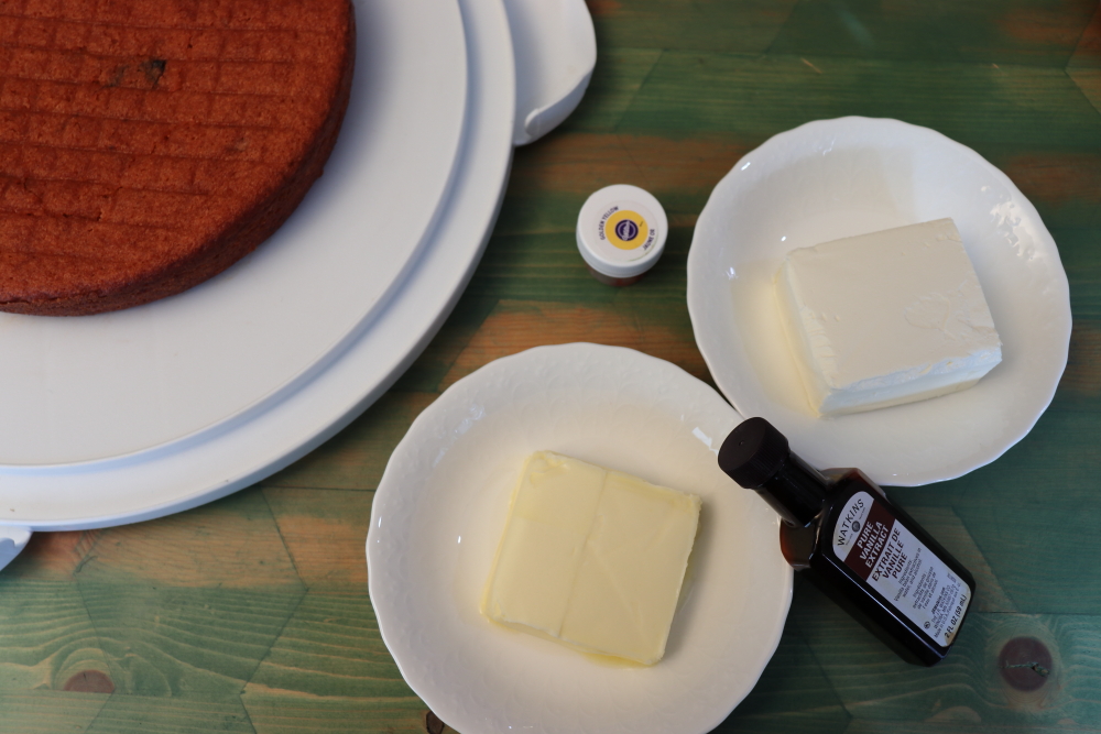 To make the icing, beat 3/4 cups of butter in a mixing bowl until smooth. Add 6 ounces of cream cheese. Blend until smooth. Add 1 tsp vanilla extract and 4 cups of icing sugar. For a less sweet icing, use 3 1/2 cup of icing sugar. Add a couple drops of yellow food colouring.