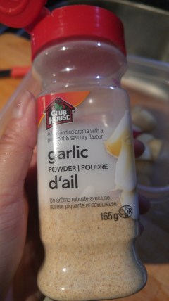 First cut the radishes and turnips in half. Coat them with olive oil, salt, pepper and a generous shake of garlic powder.