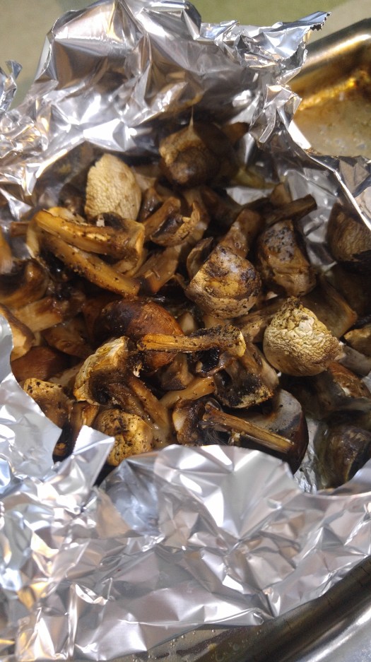 Another easy side is roasted mushrooms. Cut up about 2 cups of button mushrooms and put them in an aluminum foil bowl. Add some chunks of butter and sprinkle with salt and pepper. Bake the mushrooms in a 400 degree oven for about 30 minutes or until the mushrooms are wrinkly and shrivelled.