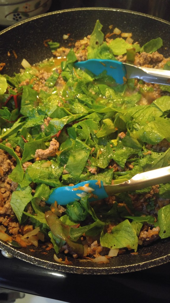 Once the beef has been browned, add the green leaves. Cook until the leaves are wilted and tender.