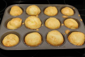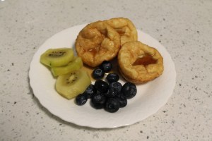 When the oven is nice and hot, take out the muffin tins (or cast iron) and put in some butter. Coat the pan and quickly pour in the batter. Place back in the oven and bake for about 18-25 min or until the pancakes are nice and golden brown. Remove from the oven and serve the pancakes with maple syrup or powdered sugar or fruit.