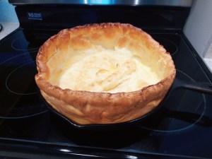 Originally Dutch Baby pancakes are made in the cast iron pan. I found doing this gave a much crisper texture and puffed up a lot. It was a very different experience. The process is the same, place the pan in the oven and preheat to 450 degrees. Put in the butter and coat the pan. Pour in the butter and bake for 25 minutes.
