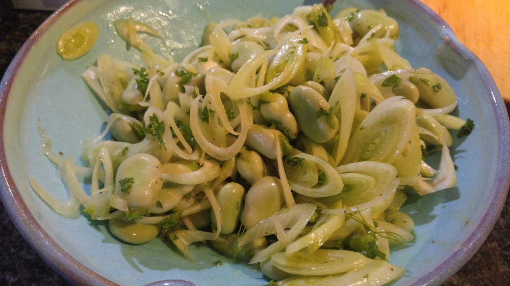 I have been experimenting with new veggies for the past couple of weeks. This time I had fava beans and fennel. I thought I would make a simple salad with these two items. Fennel has a mild licorice taste that adds some dimension to a salad and fava beans give the salad a different texture and taste.