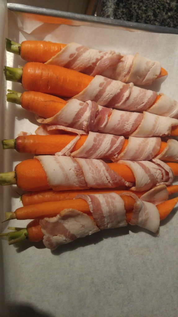 Wrap each carrot with a slice of bacon. Tuck the bacon in on itself to help hold it together when baking. The nice thing with bacon, is that you don’t need to add any salt or oil when baking.