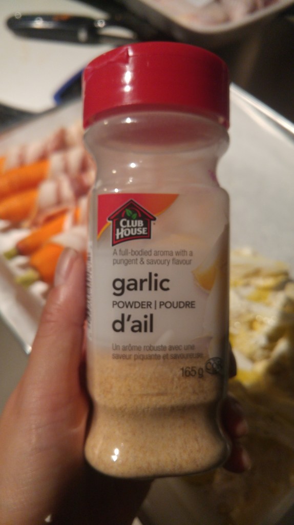 Coat the cauliflower with olive oil, salt and pepper and then sprinkle some garlic powder over it.