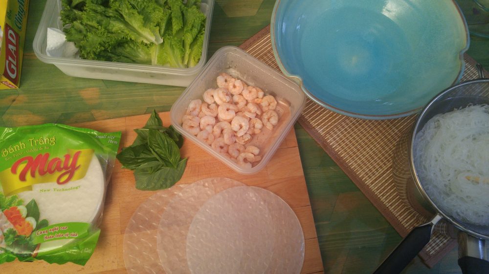 The other ingredient you will need is some vermicelli rice noodles. Prepare the rice noodles by soaking them in boiling hot water and leaving them for a couple minutes until the noodles are tender. Drain and cool the noodles before wrapping.