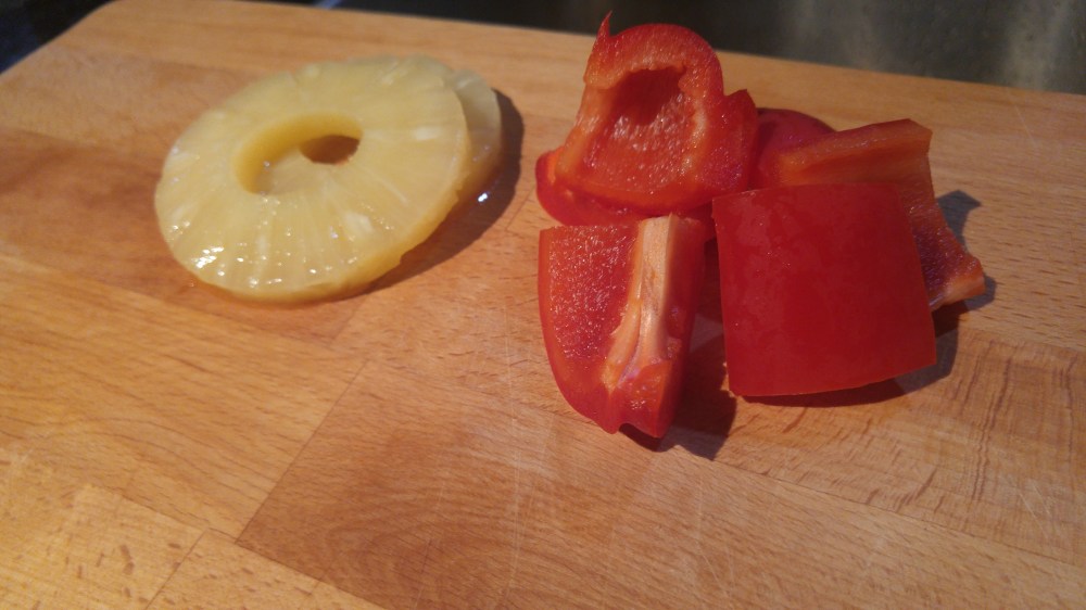 Cut the pineapple into chunks. Prepare the red pepper by removing the seeds and cutting it into cubes the same size of the pineapples.