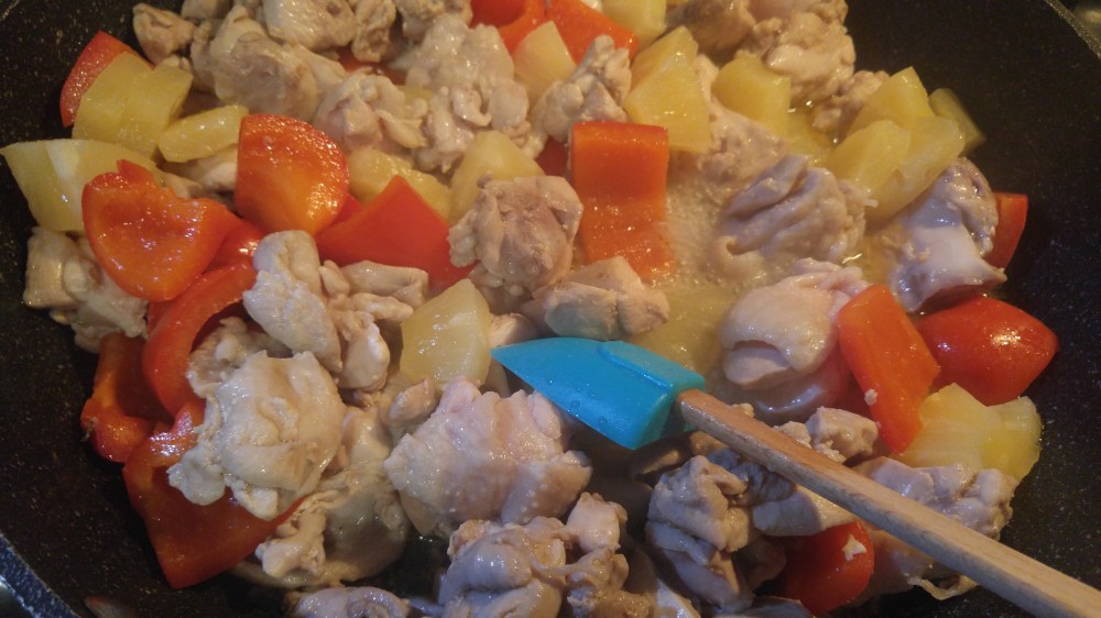 Once the chicken is cooked, add the pineapple and let all the ingredients cook down.