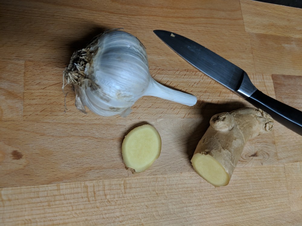 While the eggplants are cooking, prepare the sauce. You will need a slice of ginger and 2-3 cloves of garlic. Mince them and set aside for the sauce.