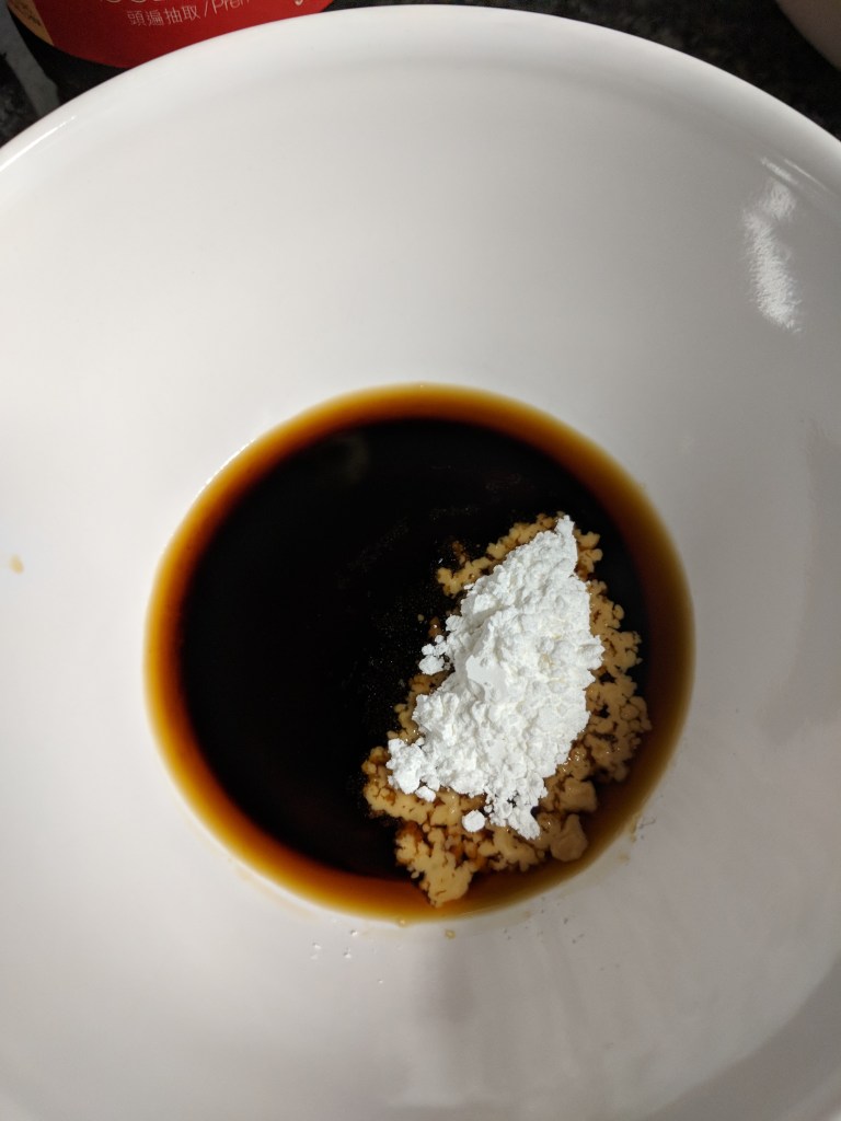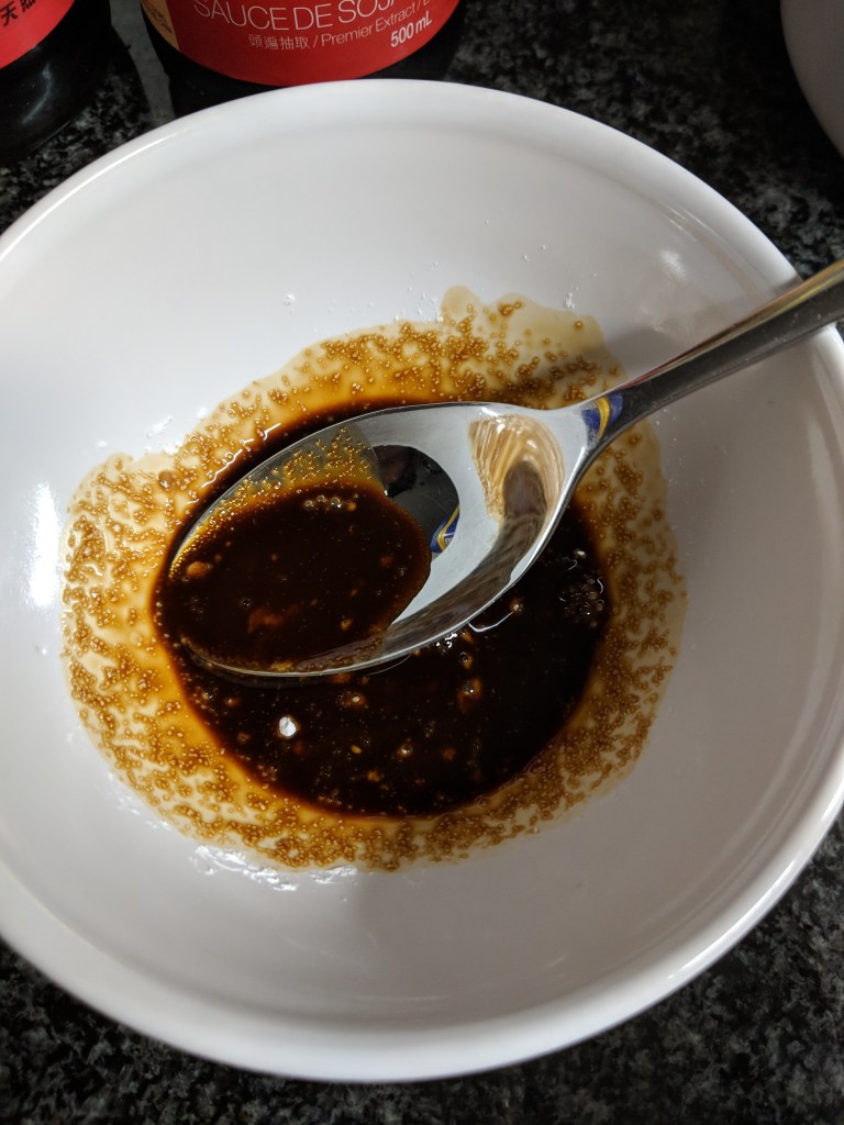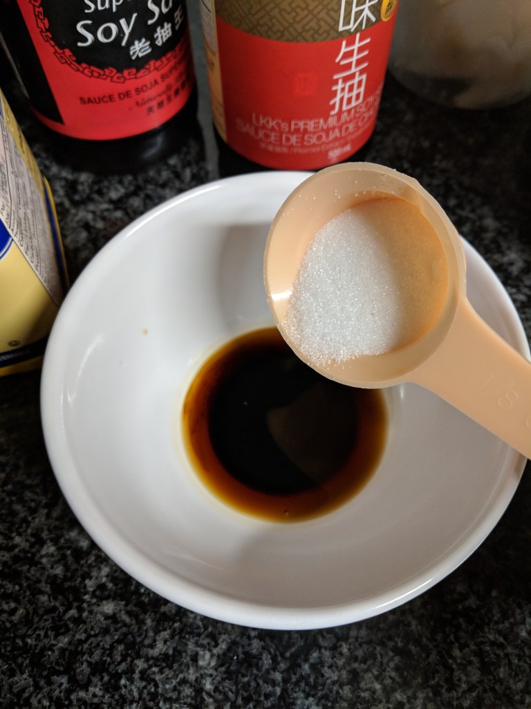 In a bowl, add 1 Tbsp of dark soy and 1/8 cup of soy sauce.