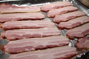 Start by baking the bacon. I used thick sliced bacon but you can use regular cut. Line a baking sheet with some tin foil and lay out the bacon. Bake at 375 degrees for about 30-45 minutes.