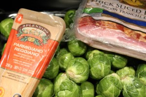 For this recipe you will need, bacon, Brussels sprouts and Parmesan cheese.
