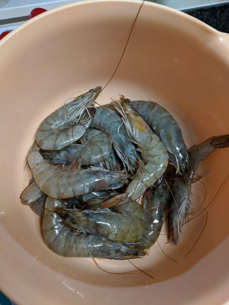 I started by cleaning the shrimp. Choose whole shrimp with the shells. The shrimp heads will be saved and used for a simple seafood broth. I got about 1.5 pounds of shrimp.