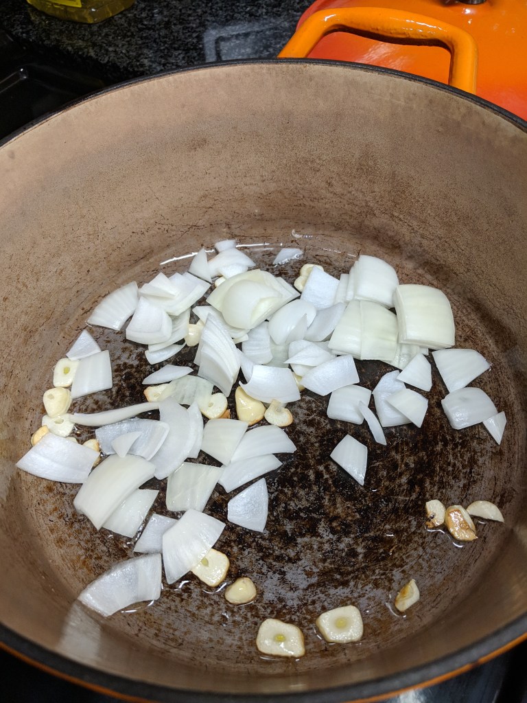 In a large stock pot, saute the garlic and onions in a tablespoon of oil.