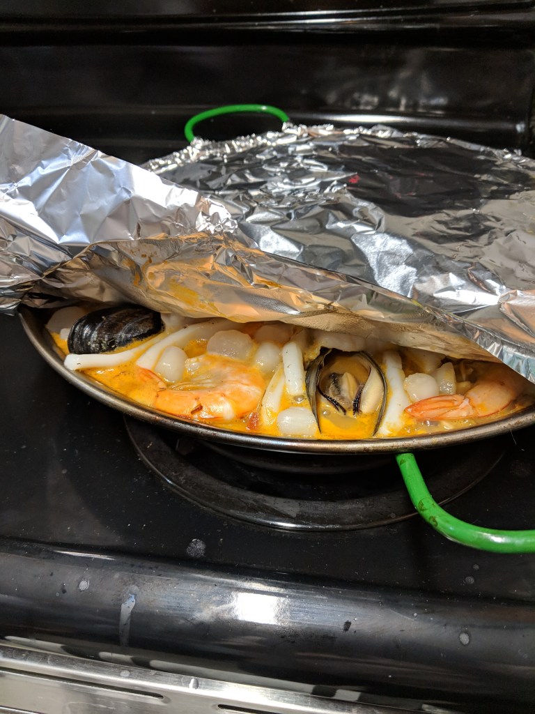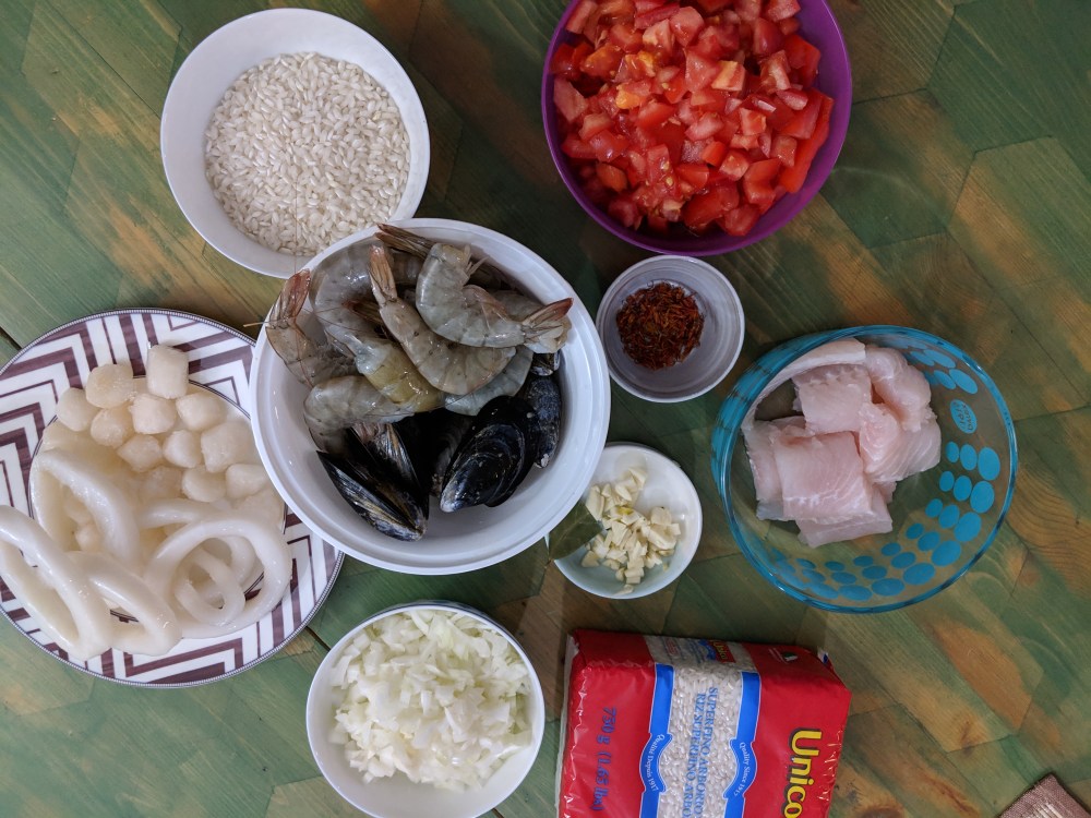 - a variety of seafood (shrimp, mussels, scallops, squid, fish), about 5 cups worth