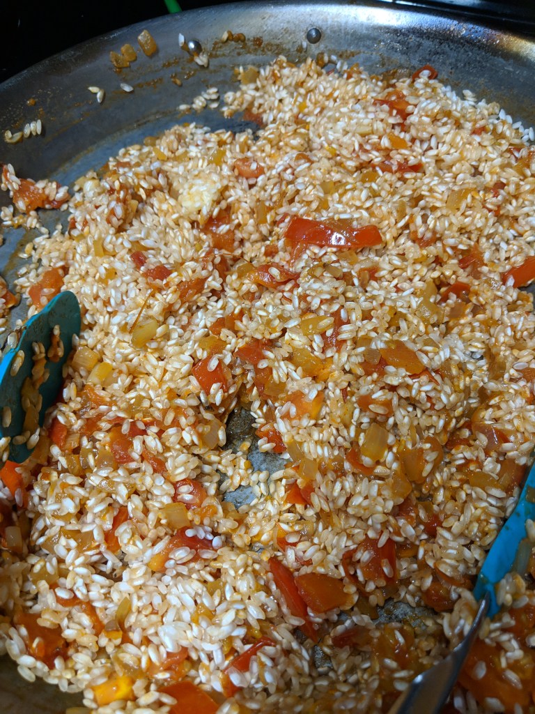 Leave covered for about 15-20 minutes or until the rice is al dente. Remember to continue to rotate the pan. When the rice is almost done, you want to remove the foil so that the water evaporates slowly. Be careful because the bottom can burn easily.