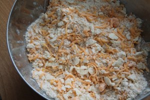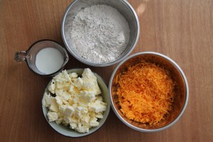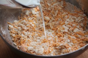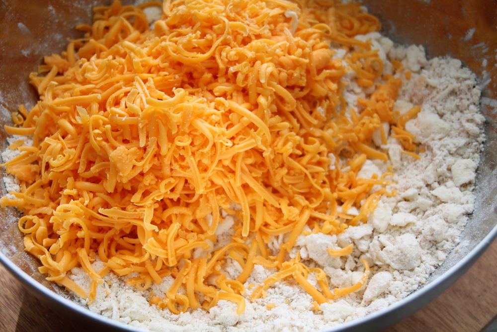 Mix together the butter and flour. Cut the butter until the flour and butter resembles pea sized pieces. Add in the Cheddar cheese and mix together. Add the milk to the dough. Knead together until the dough is mixed. Don’t over work the dough since you don’t want the dough to be too tough.