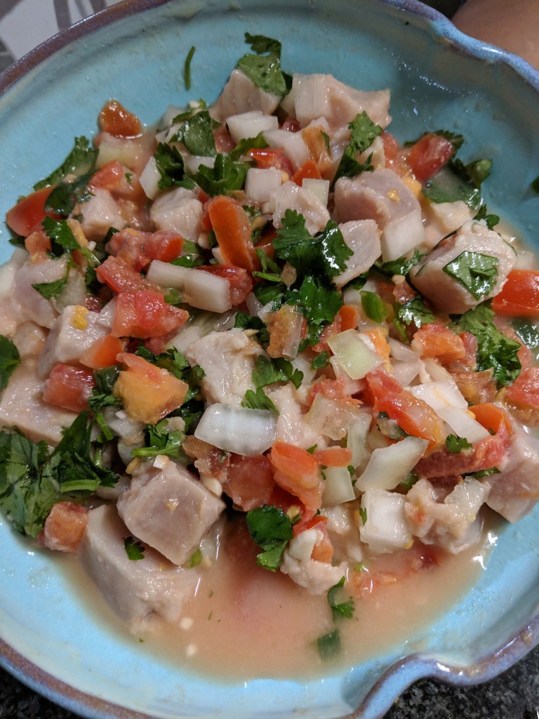 Ceviche is a dish made with raw fish that is marinated in citrus juice. This fish is not cooked so you need to use fish that has been properly frozen to prevent parasites. Any white fish in the store is something that you can use at your own risk. (I have had bad experiences with non-sushi grade fish.) When the raw fish is marinated in citrus juices, it is denatured or “cooked”. The results is an almost sashimi-like texture with an exterior that is firm.