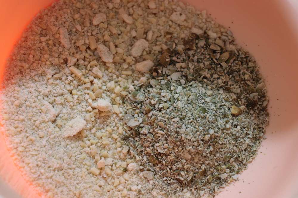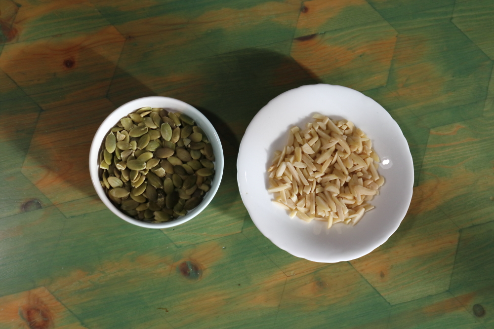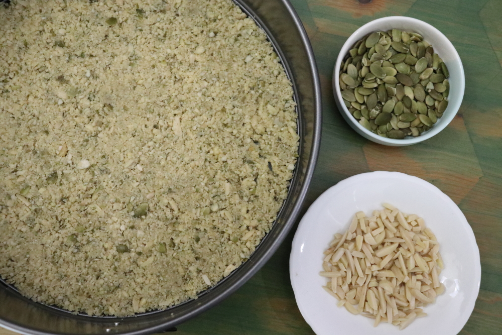 To make the crust, you will need 1 cup pumpkin seeds and 1 cup of almonds. Substitute this with your favourite nuts.