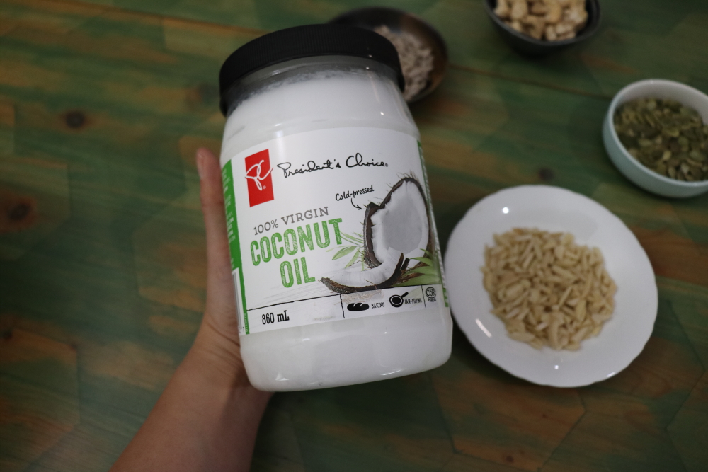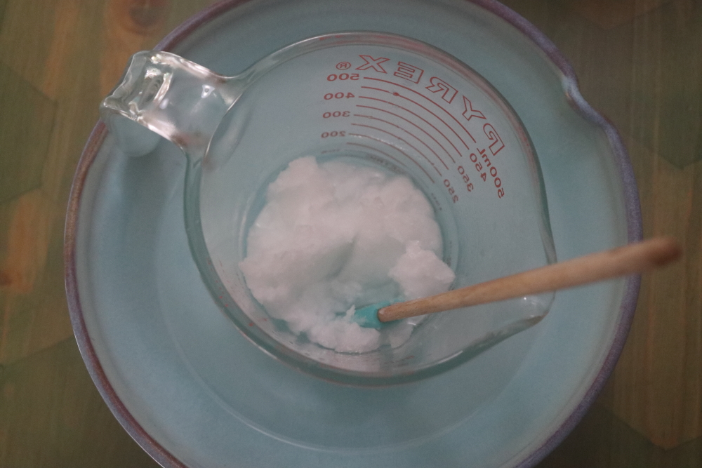 Melting the coconut oil is easy as it becomes a liquid in hot water. Place about 3/4 cup of coconut oil in a bath of hot water. Stir until the oil has melted.