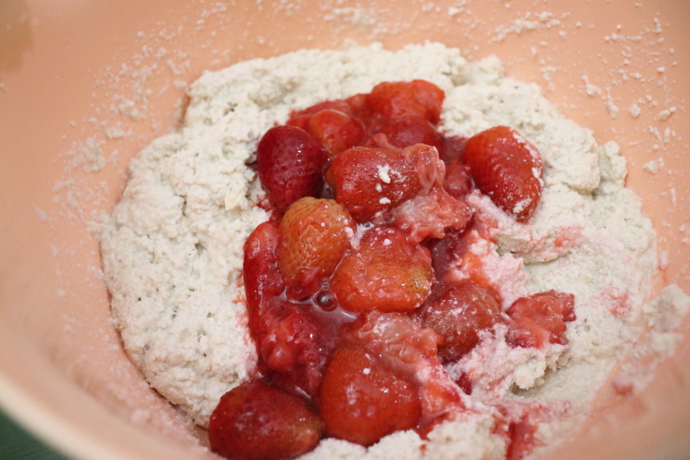 Add about 4 cups of fresh or frozen strawberries. If you are using frozen, make sure you thaw them out before using them.