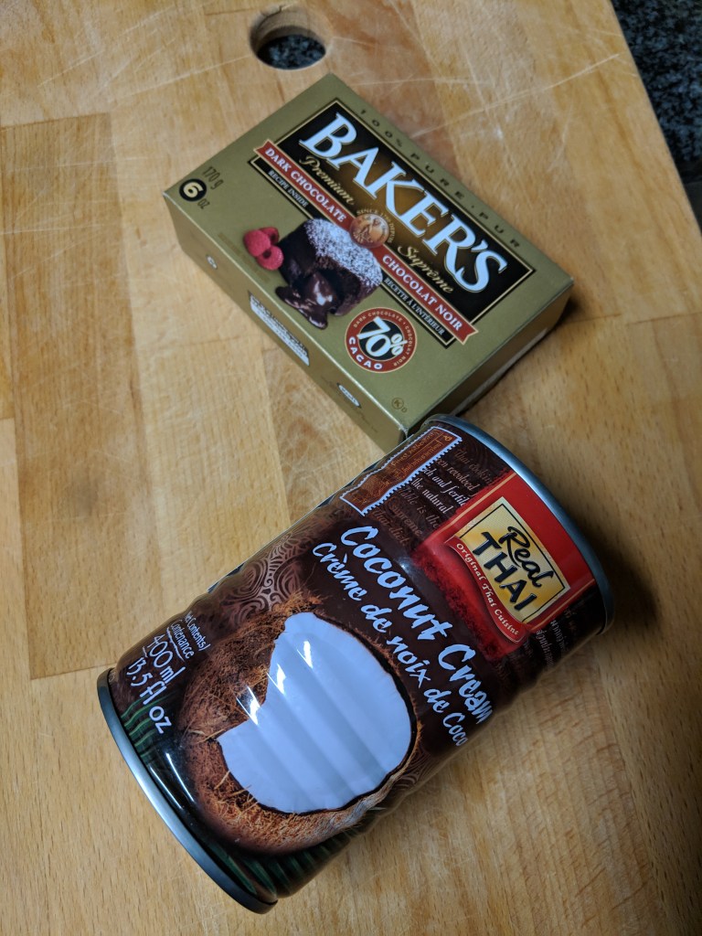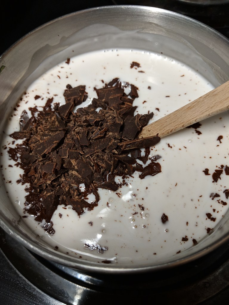 Heat up the coconut cream on the stove top at a medium-low heat. You want the coconut cream to melt and heat up the chocolate but not to burn it.
