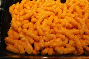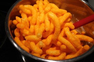 Now everyone knows how to make rice crispy squares: rice crispies, marshmallows and butter. For this recipe, instead of rice crispies you use cheetos puffs.