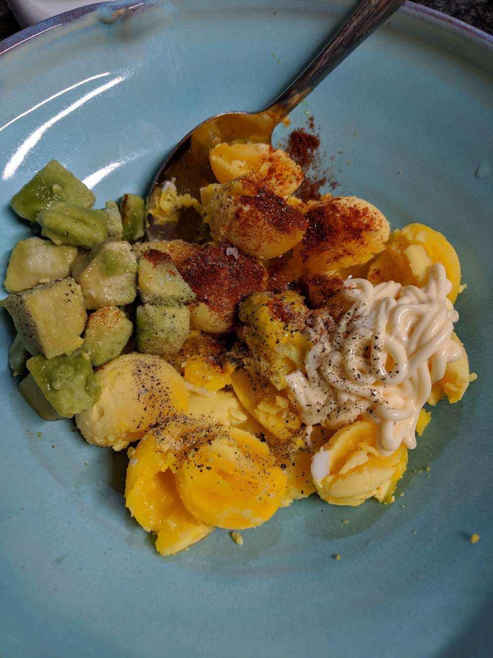 Carefully cut each egg in half and scoop out the yolk. The yolk should easily pop out. To the yolk add 1/4 cup ripe avocado, 1/2 tsp paprika, 1/4 cup mayo, and a dash of salt and pepper. I recently discovered frozen avocado and it is wonderful!! Always a perfect ripeness and you can use as little or as much as you want.