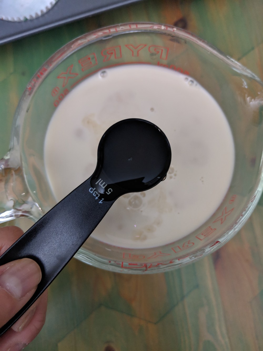 Begin by preparing the batter. Portion out 1 cup of soy milk. I substituted the soy milk with oat milk and it worked brilliantly. To the soy milk, add 1 teaspoon of apple cider vinegar. Set this mixture aside for a couple minutes so that it curdles.