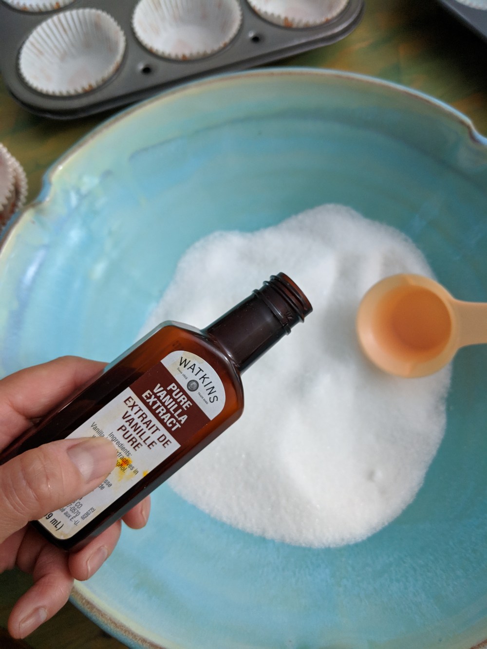 In a separate mixing bowl, add 3/4 cup of sugar, 1 1/2 teaspoon vanilla extract, and 1/3 cup of canola oil.