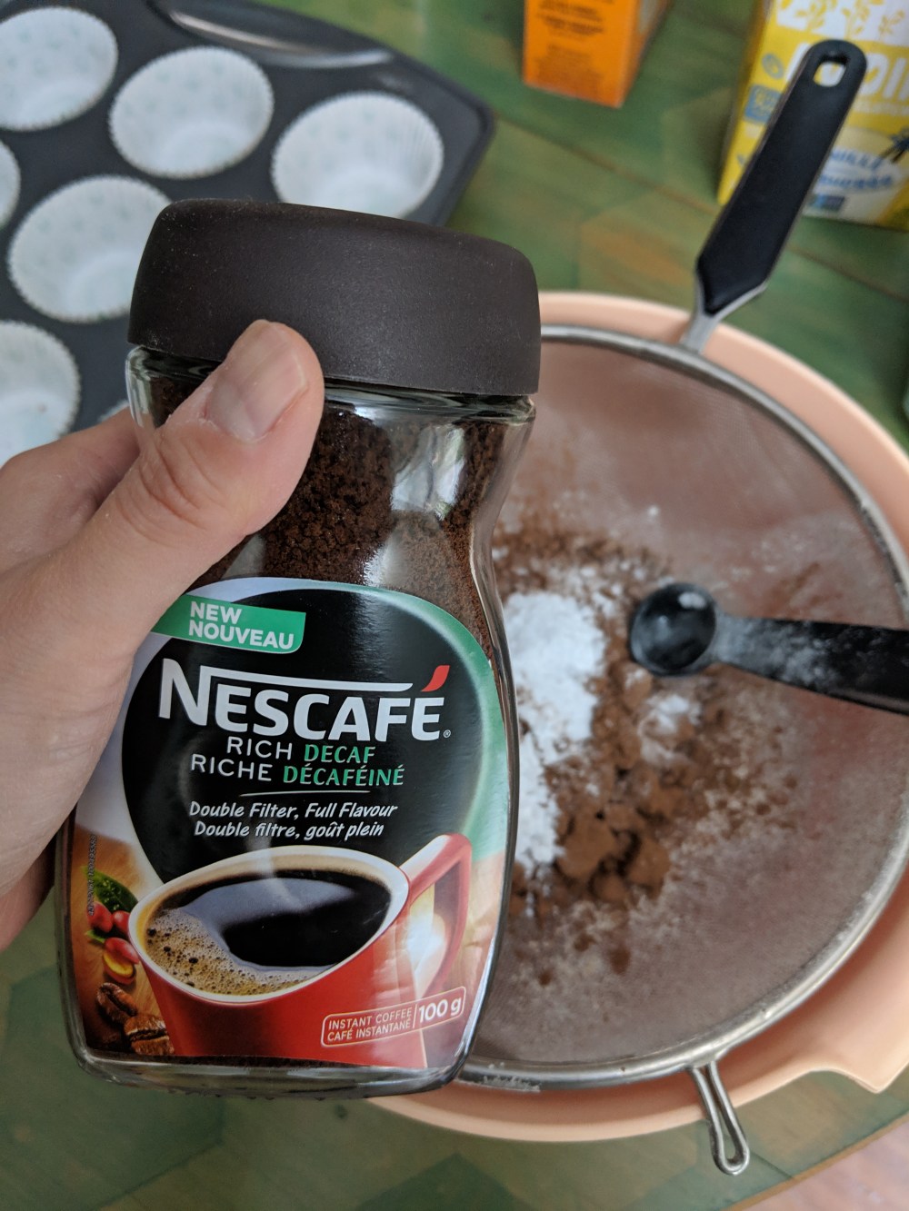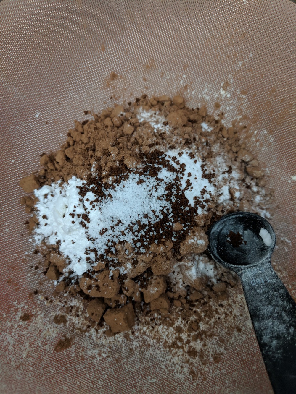 Portion out 1 cup flour, 1/3 cup cocoa powder, 3/4 teaspoon baking soda, 1/2 teaspoon baking powder, and 1/4 teaspoon salt. I also added 1 teaspoon of instant coffee. I find this enhances the chocolate flavour.
