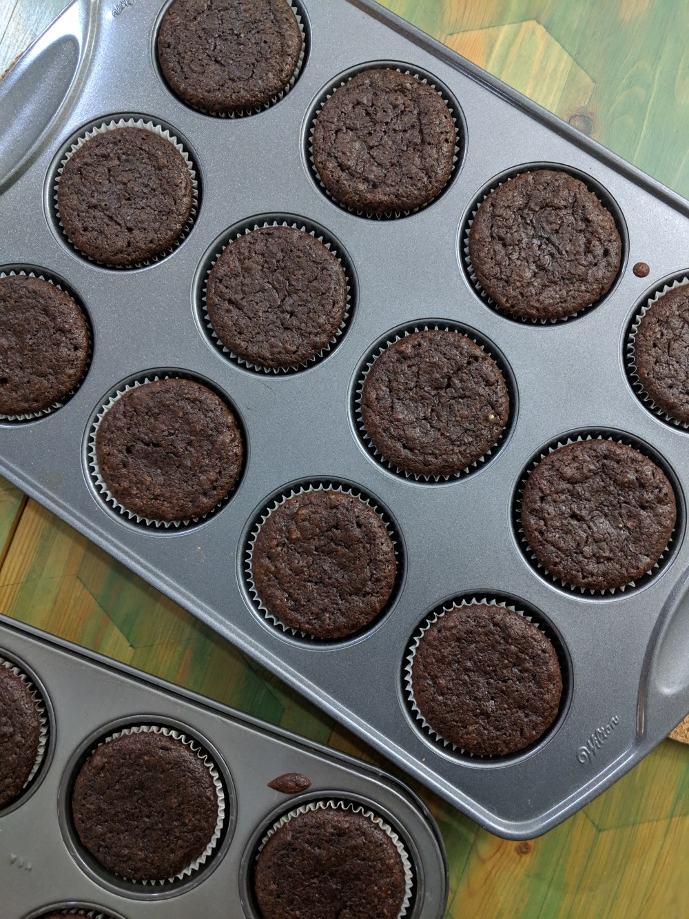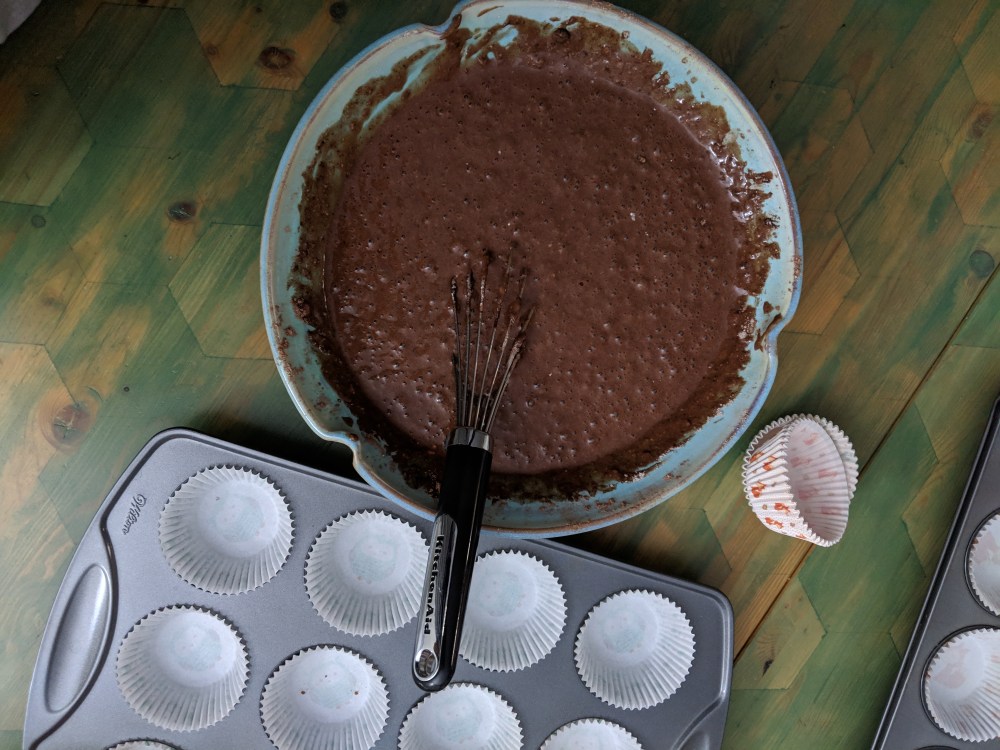 Preheat the oven to 350 degrees Celsius. Portion the batter into cupcake liners and bake for 20 minutes or until a toothpick comes out clean.