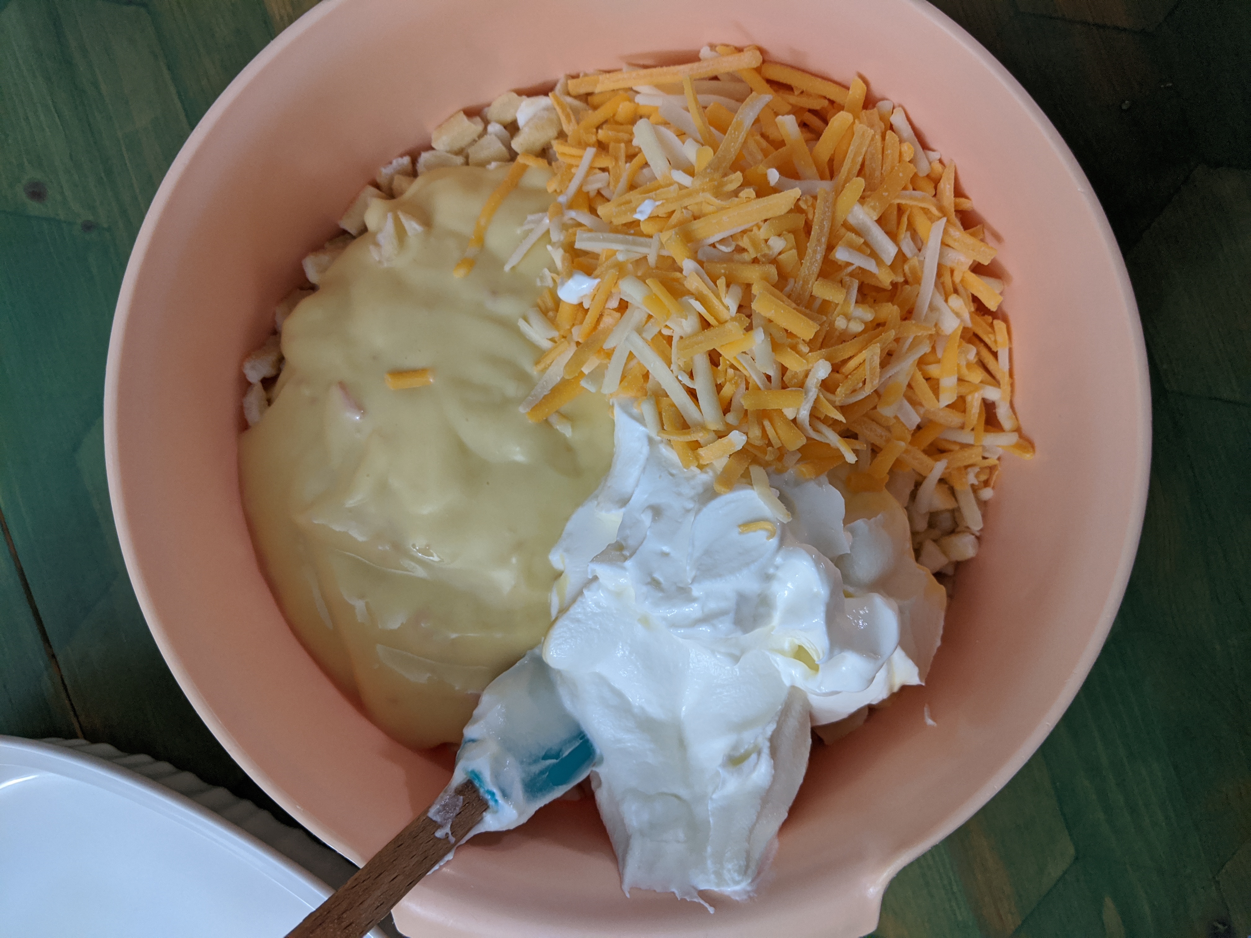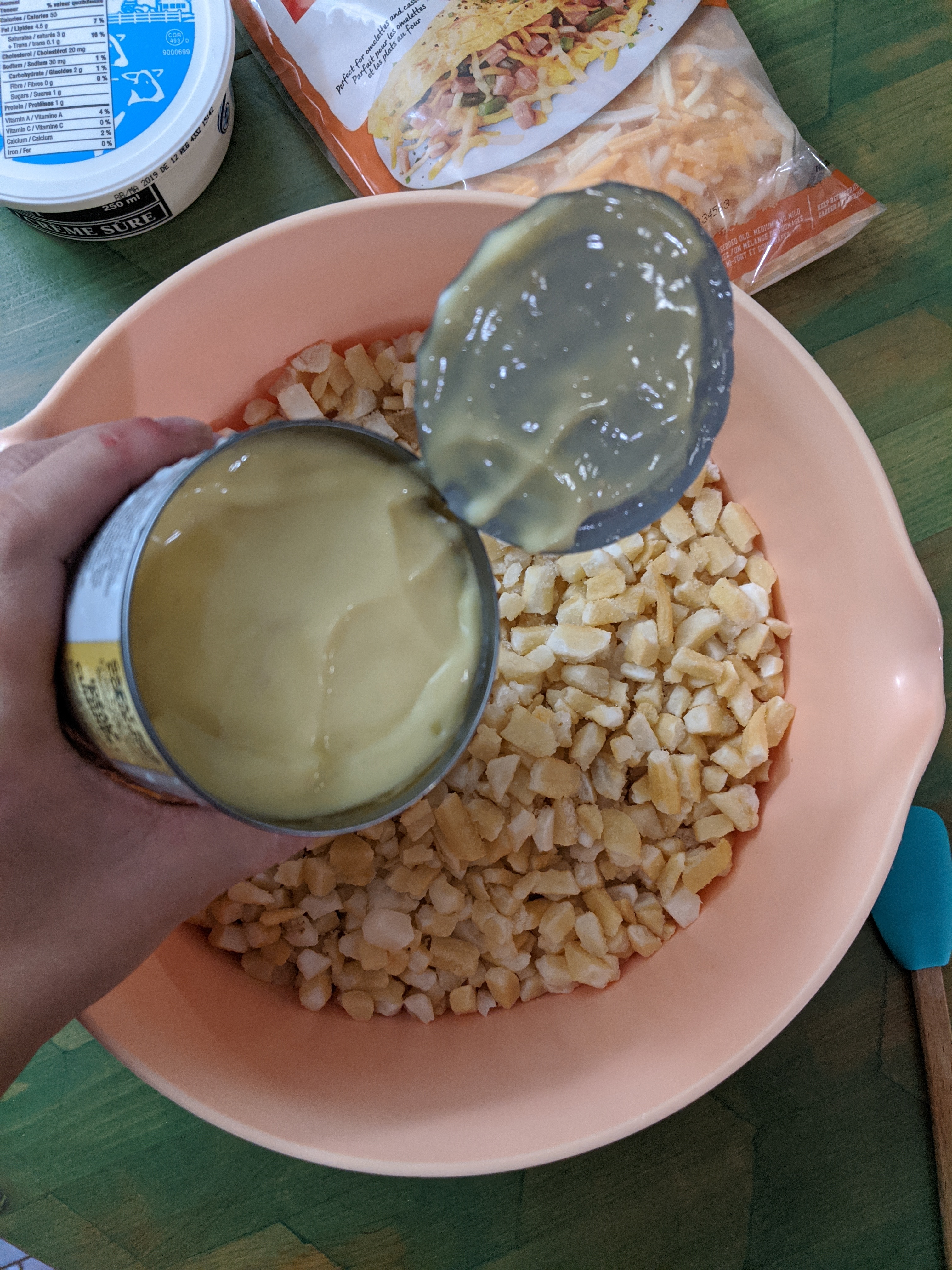 When the onions are cooked, set them aside. In a mixing bowl, add the thawed hashbrowns. Add the can of chicken soup, 1 cup of sour cream, and 1 cup shredded cheddar cheese.