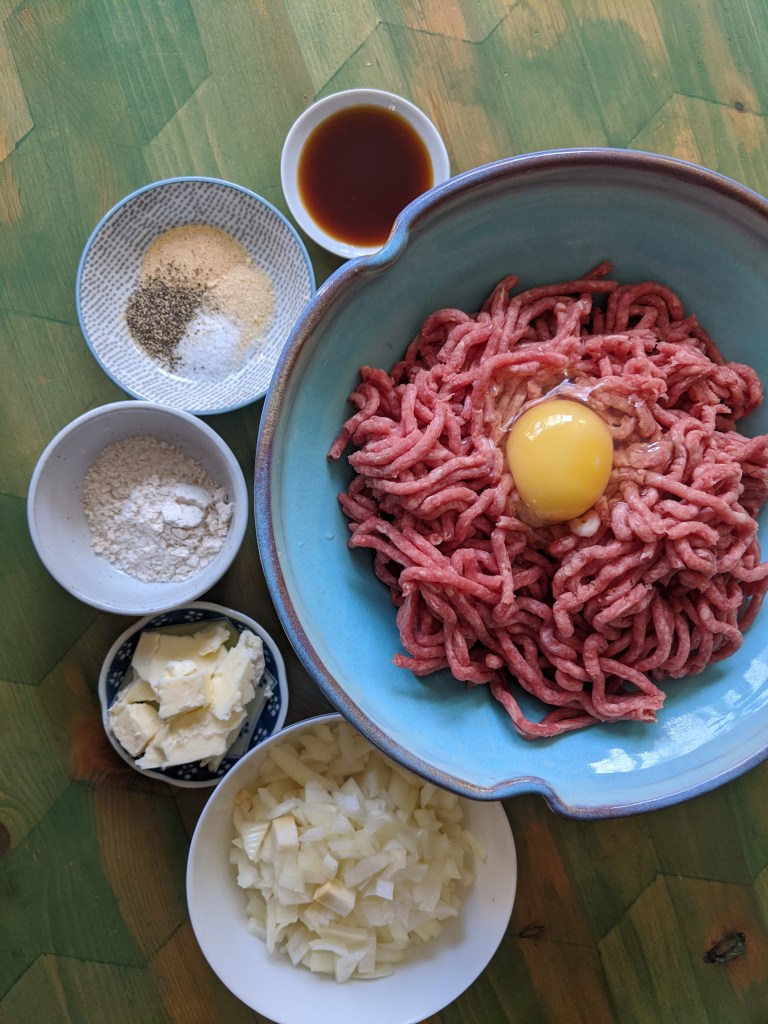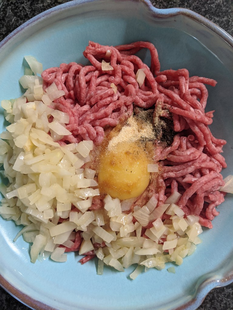 To make the patties, you will need 1 lb ground beef, 1/2 tbsp onion powder, 1/2 tbsp garlic powder, 1/4 diced onion, 1 egg, 2 tbsp Worcestershire sauce, salt and pepper.