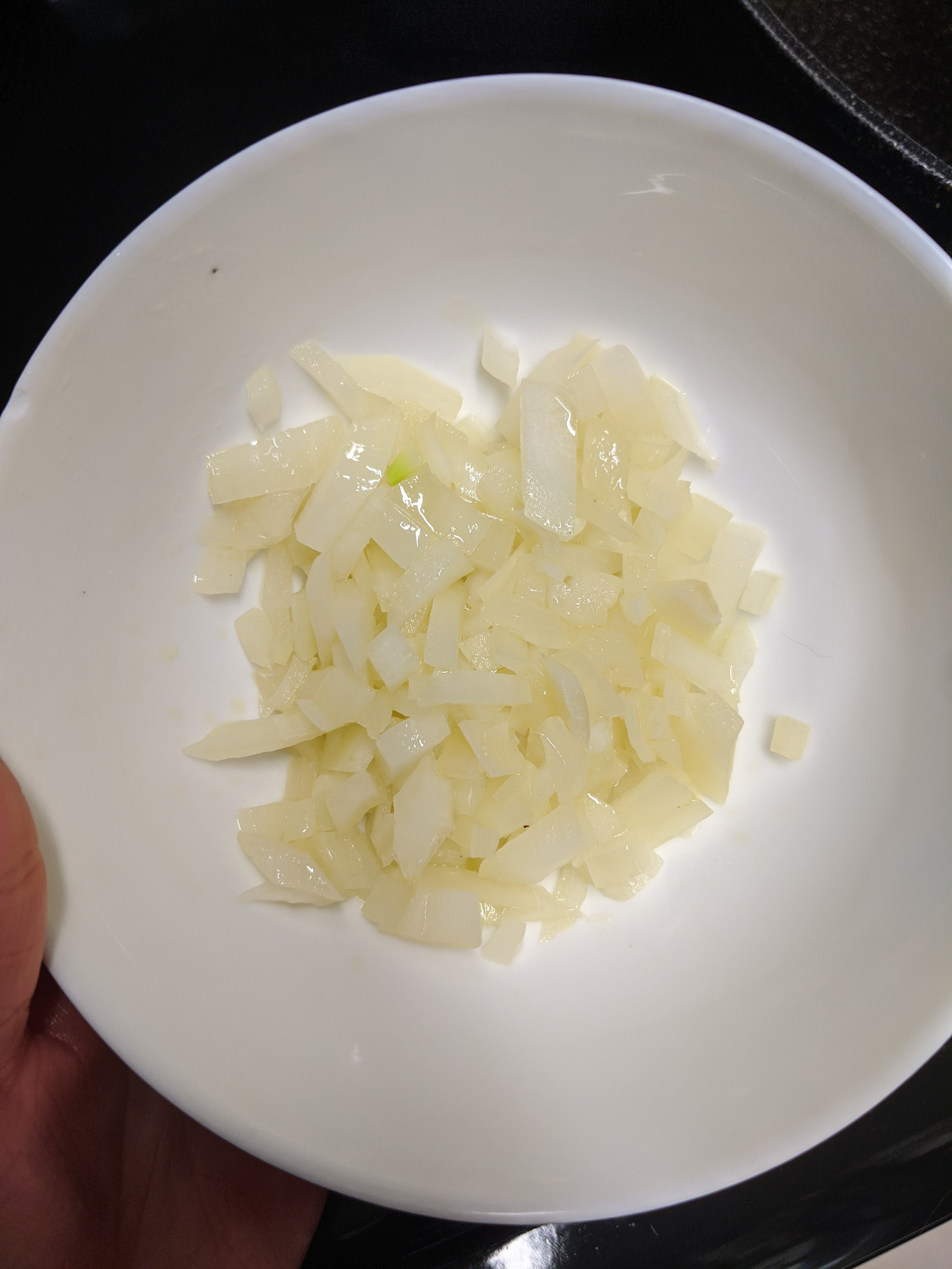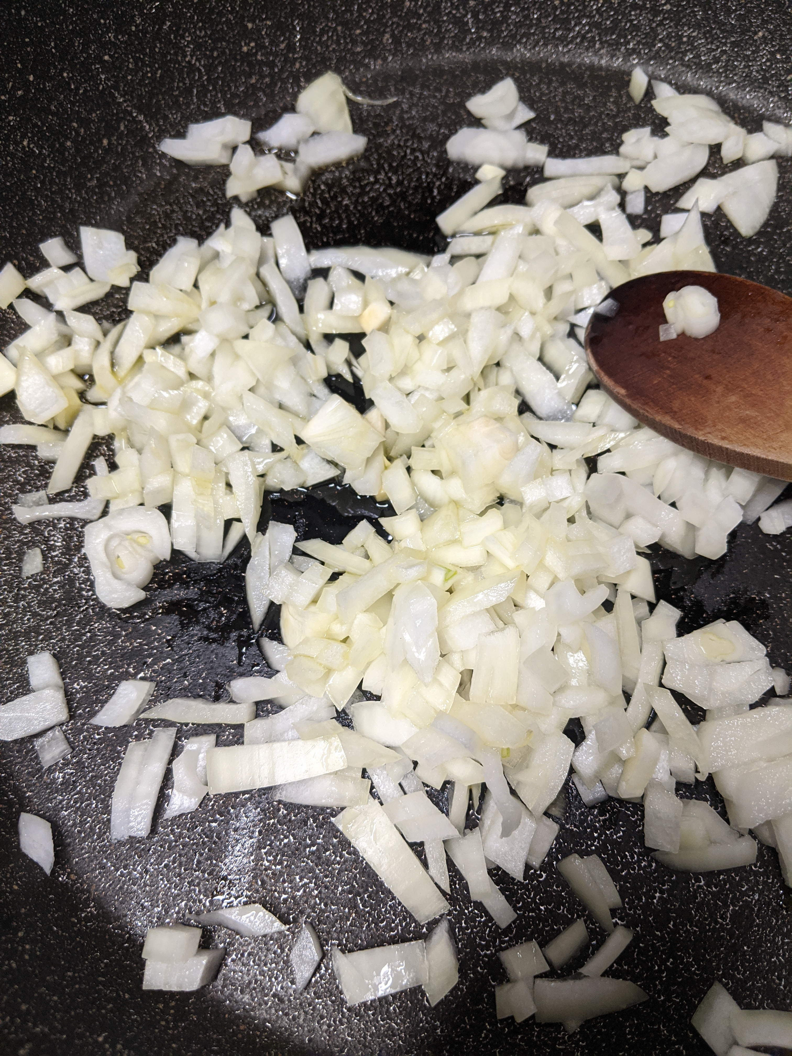 I’m never a huge fan of raw onions in my patties so I like to take the extra step and sauté the onions until they are translucent. Do this with all the onions that you need for the meal. You will need 1/4 cup onion for the patties and 1/4 cup onion for the gravy.