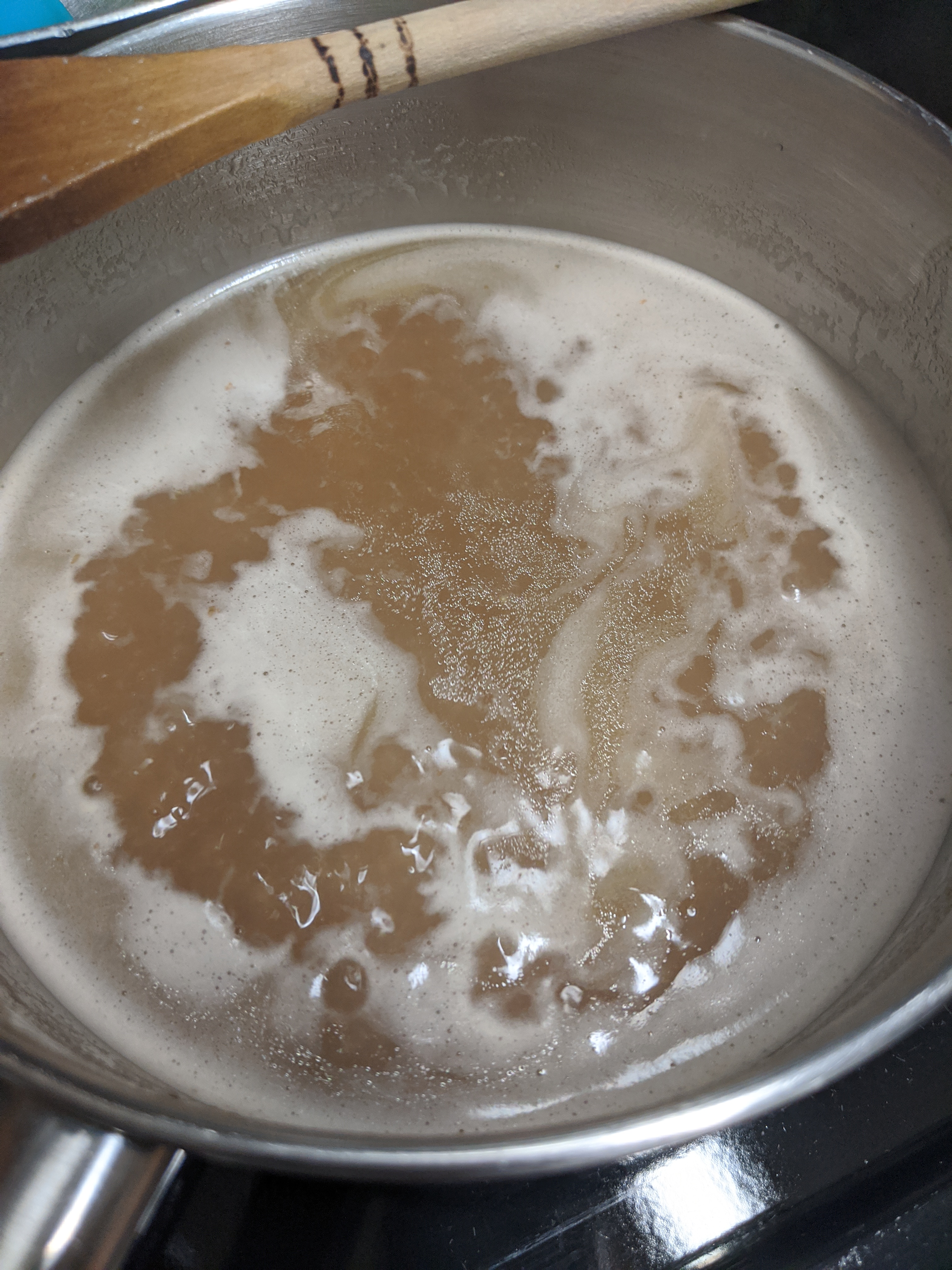 While the patties are resting. Make the gravy. You will need 2 tbsp flour, 2 tbsp cornstarch, 2 cups beef broth, 4 tbsp butter and 1/4 cup onion. Begin by making a roux. Add the 4 tbsp of butter into a saucepan. When it is melted, add 2 tbsp of flour. Stir the flour and cook for a couple minutes until the flour and butter bubbles and turns slightly brown.