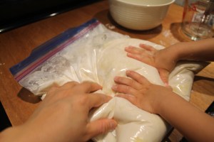 In a ziploc bag, combine 1 cup of flour, yeast and sugar. Mix together. To this add 1 cup of warm water. Seal the bag, removing the air and mix together. Have your toddler shake the bag or place it on the table and have them mix it by squishing the liquid around. When mixed, let the bag rest for about 10 minutes. The yeast will begin to bubble and expand.