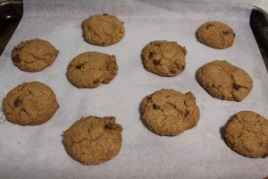 Add the chickpea flour, coconut flour and baking soda. Mix well. The dough will start getting stiff but shouldn’t be too dry. Finally add the chocolate chips and mix. Scoop out the dough into 1 inch balls. Leave space between the cookies as they will spread slightly.