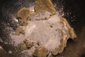 Notice that the dough looks stringy and clumpy. Keep rinsing and kneading.